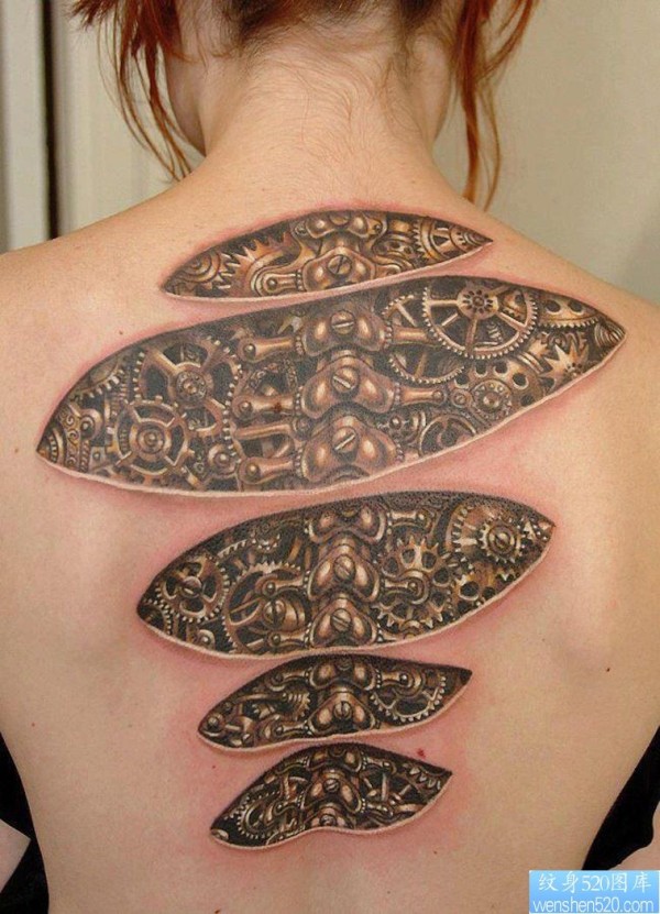 美女后背一幅霸气的机械纹身图片_后背纹身图案大全_纹身图吧