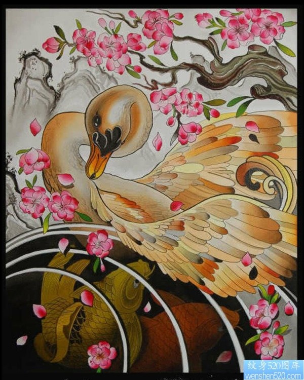 鸭子鲤鱼花文身图片由_后背纹身图案大全_纹身图吧