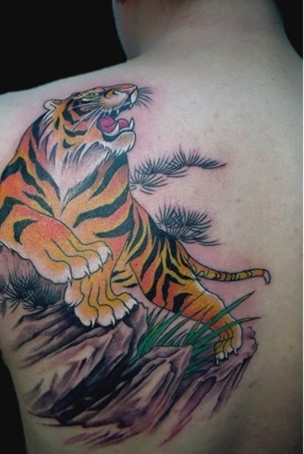 背部左肩老虎上山图形纹身_后背纹身图案大全_纹身图吧