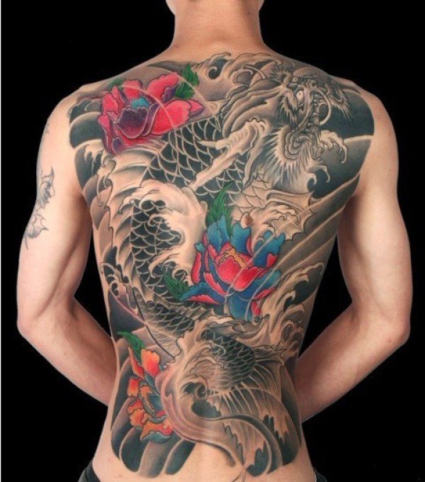 鳌鱼和莲花组合的一款大气的背部纹身_后背纹身图案大全_纹身图吧