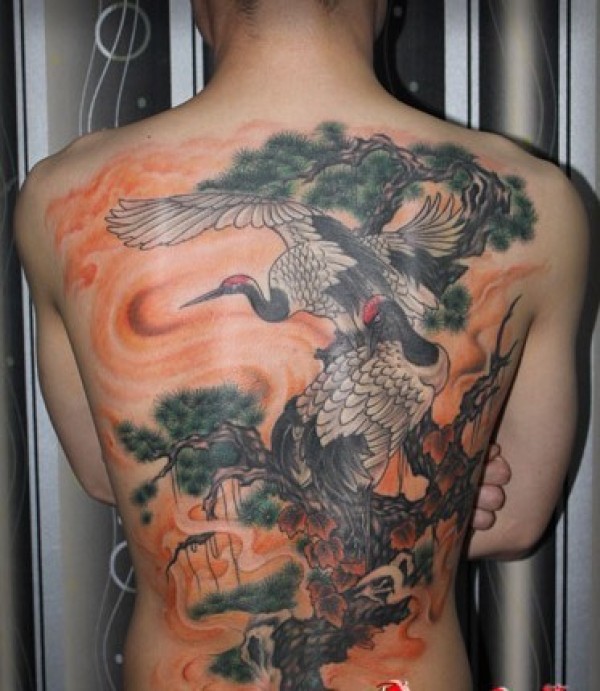 女士后背满背彩色白鹤纹身图案_后背纹身图案大全_纹身图吧