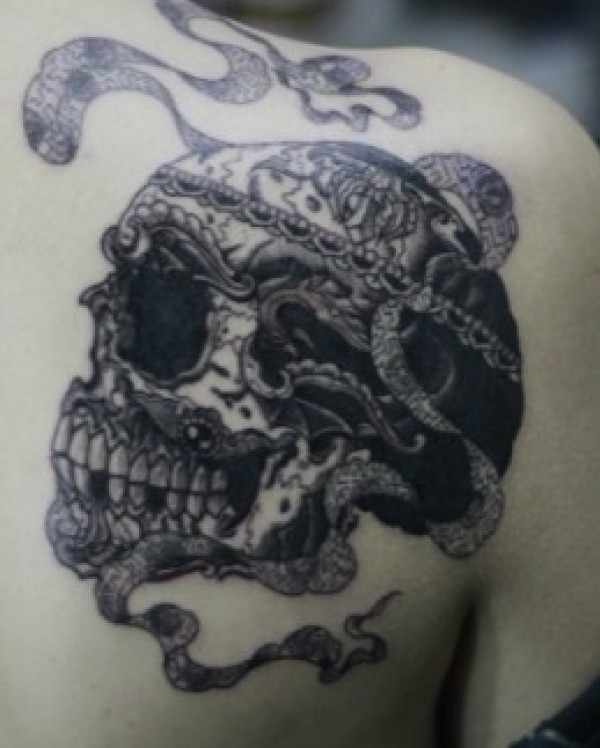 骷髅和蛇皮的组合图形_后背纹身图案大全_纹身图吧