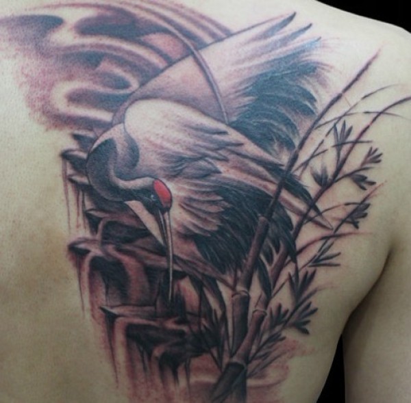 背部一只孤独的丹顶鹤纹身_后背纹身图案大全_纹身图吧