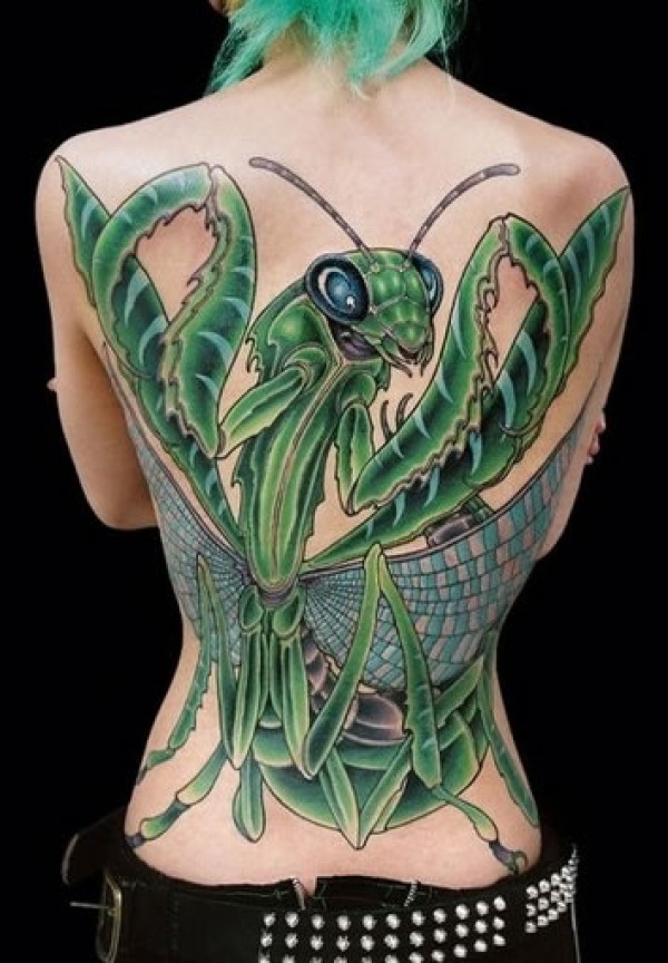 后背上绿色的大螳螂纹身图案欣赏螳螂是昆虫界_后背纹身图案大全_纹身图吧