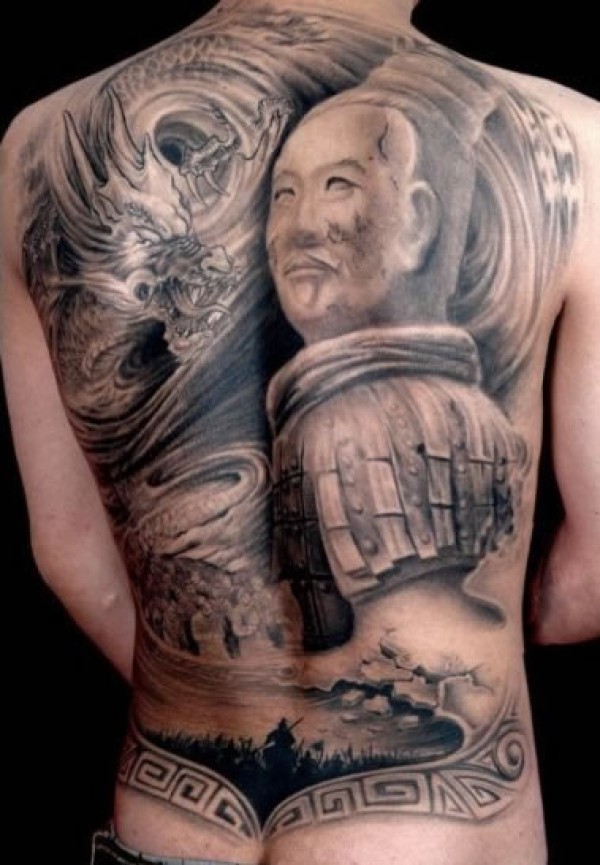 满后背素色兵马俑纹身及手稿欣赏带龙兵马俑纹_后背纹身图案大全_纹身图吧