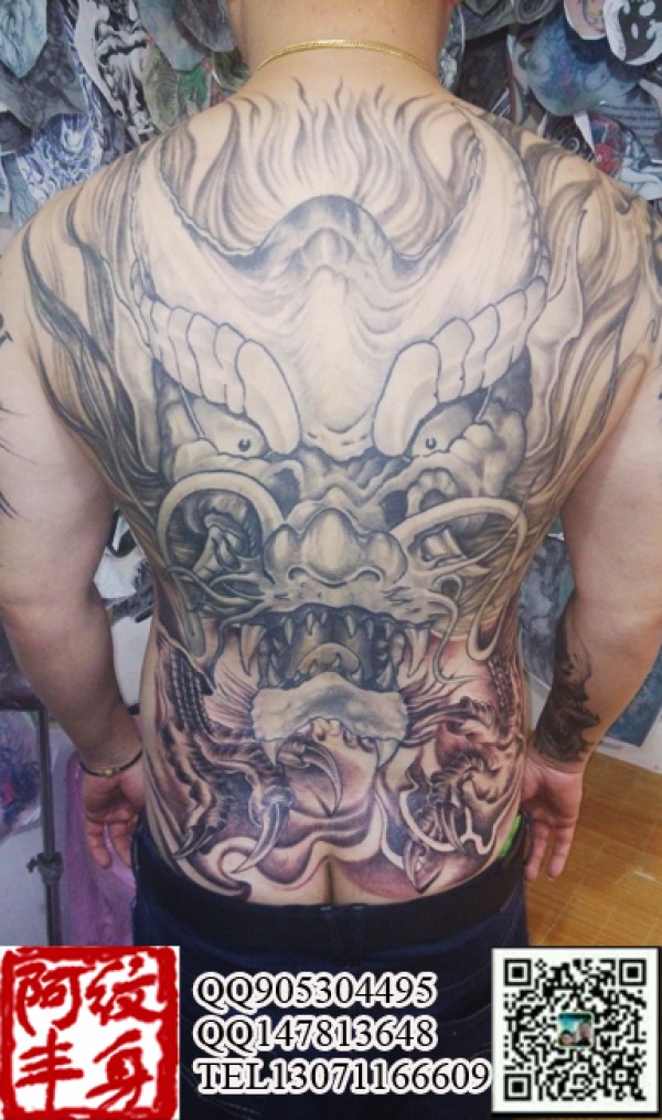 后背男龙女凤纹身图案欣赏男士满背威武的龙头_凤凰纹身图案大全_纹身图吧
