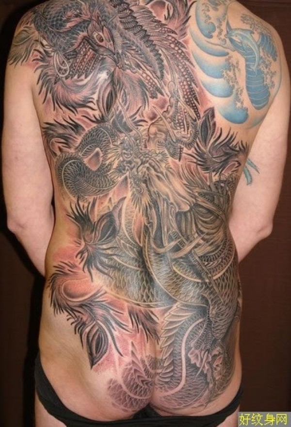 后背龙凤呈祥纹身图案欣赏满背素色游龙戏凤纹_凤凰纹身图案大全_纹身图吧