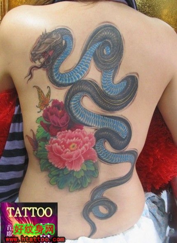 北京凤凰纹身设计蛇与牡丹纹身图案,加了两只_凤凰纹身图案大全_纹身图吧