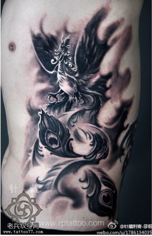 侧腰黑灰凤凰纹身图案_凤凰纹身图案大全_纹身图吧