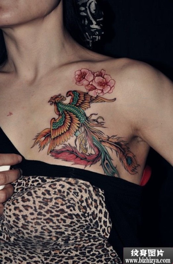 女生胸前火凤凰纹身图案图案图片_凤凰纹身图案大全_纹身图吧