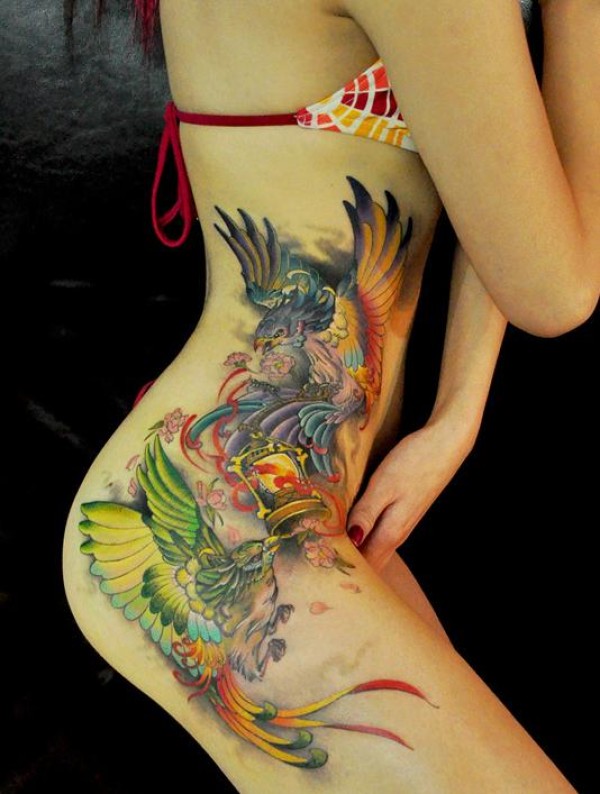 武汉纹身网提供一款女性侧腰彩色凤凰纹身图案_凤凰纹身图案大全_纹身图吧