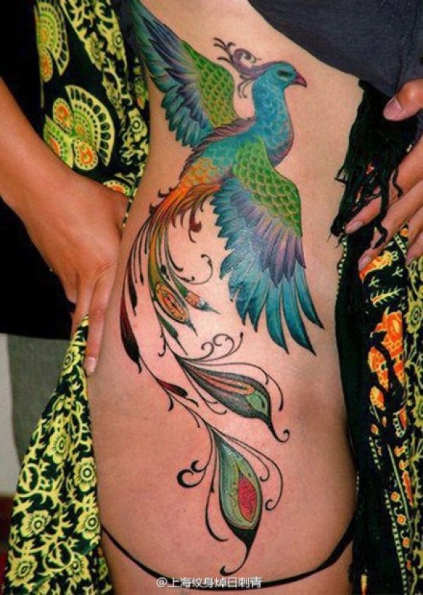 美女腰部潮流很酷的彩色凤凰纹身图案_凤凰纹身图案大全_纹身图吧