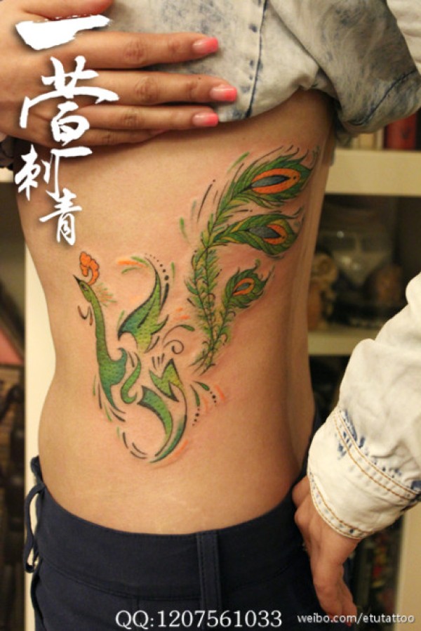 美女侧腰漂亮的彩色图腾凤凰纹身图案_凤凰纹身图案大全_纹身图吧