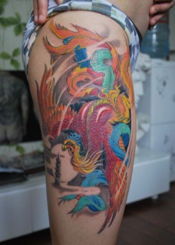 腿部一款精美的彩色凤凰纹身图案_凤凰纹身图案大全_纹身图吧
