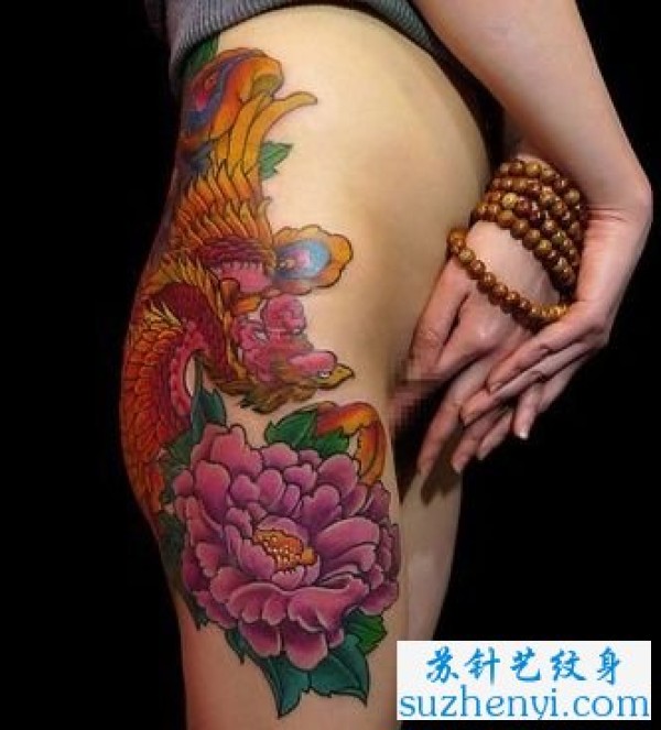 臀部彩色凤凰牡丹纹身_凤凰纹身图案大全_纹身图吧