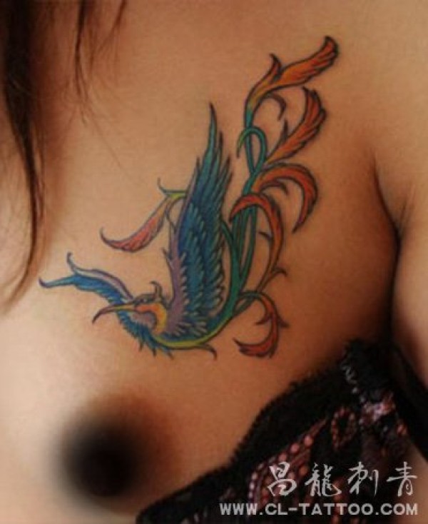 美女前胸小凤凰_女生彩色_凤凰纹身图案大全_纹身图吧