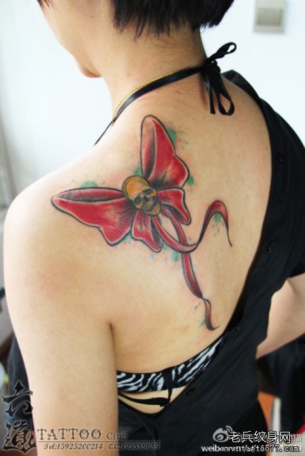 女生喜欢的肩背蝴蝶结纹身图案_蝴蝶纹身图案大全_纹身图吧
