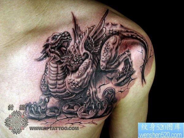 胸口石化风披肩貔貅纹身图案_貔貅纹身图案大全_纹身图吧