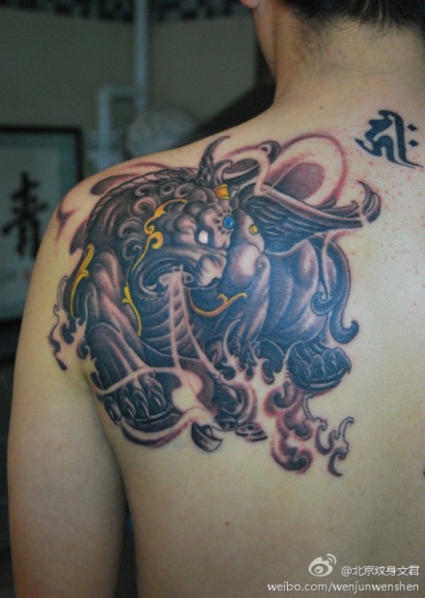 男人肩背帅气经典的招财貔貅纹身图案_貔貅纹身图案大全_纹身图吧