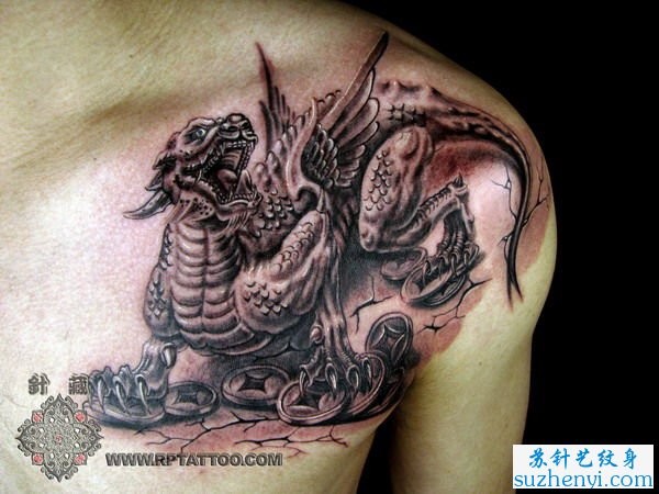 胸口石化风披肩貔貅纹身图片_貔貅纹身图案大全_纹身图吧