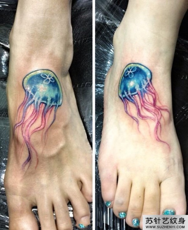 脚背彩色水母情侣创意夏日纹身_情侣纹身图案大全_纹身图吧