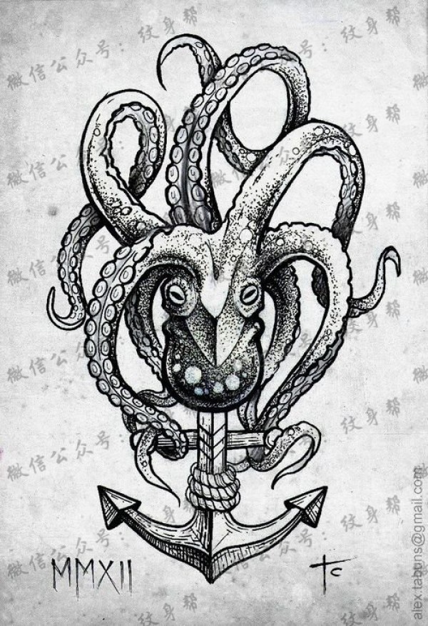 船锚章鱼纹身手稿图案