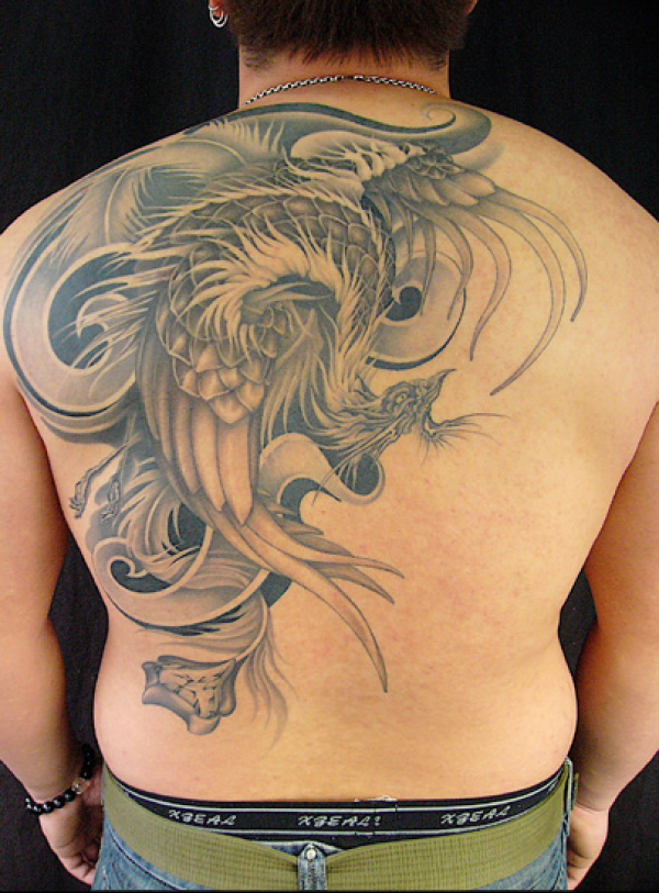 男士背部黑灰凤凰纹身图案