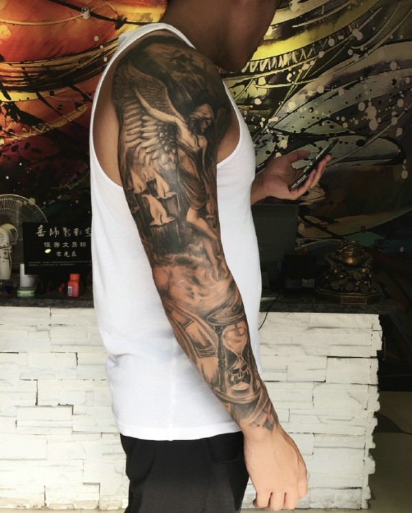 花臂黑白天使纹身刺青个性独特