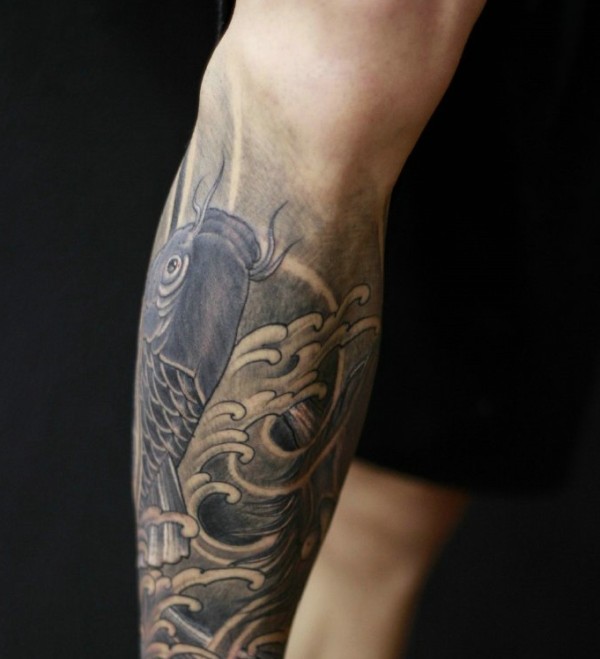 男士小腿部落的黑白大鲤鱼纹身