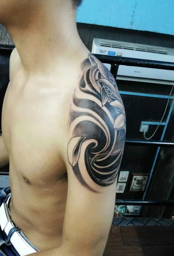 过肩膀的莲花鲤鱼纹身是那么的好看