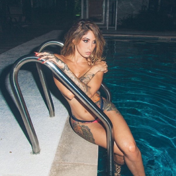 泳池里性感迷人的欧美女生个性图腾纹身