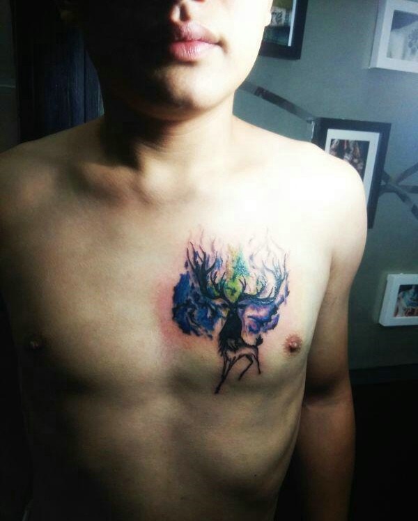 胸前小巧玲珑的彩色小麋鹿纹身