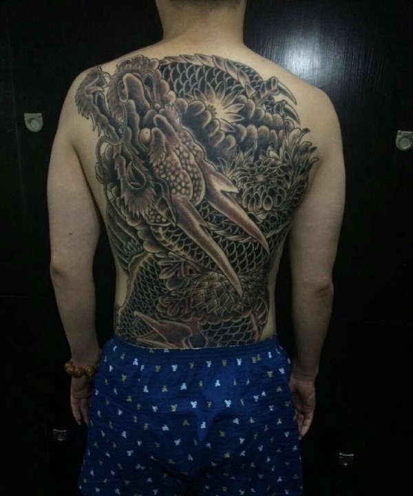 胆量十足的满背黑白邪龙纹身