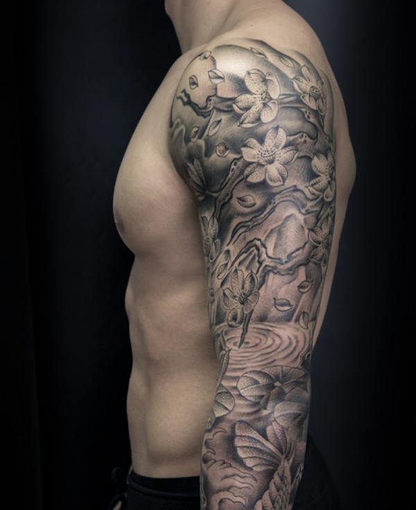 男人大臂黑白彼岸花骷髅_黑白纹身图案大全_纹身图吧