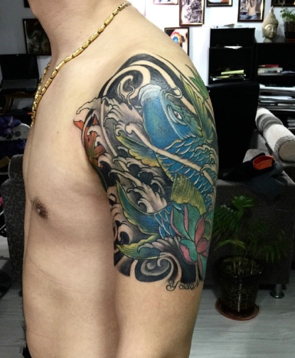 精彩丰富的大臂鲤鱼纹身图片