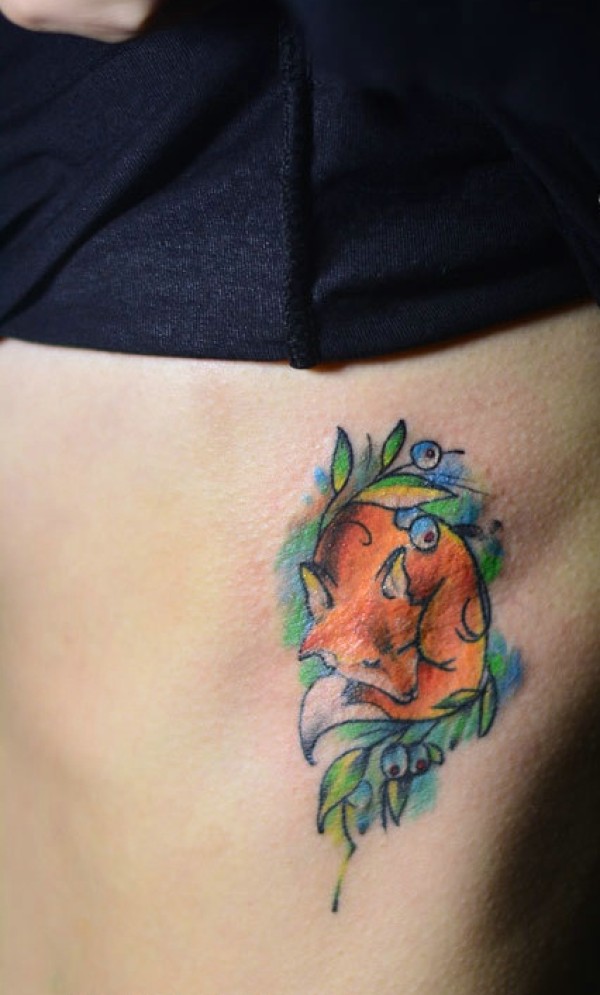 女生侧腰部彩色小狐狸纹身图片