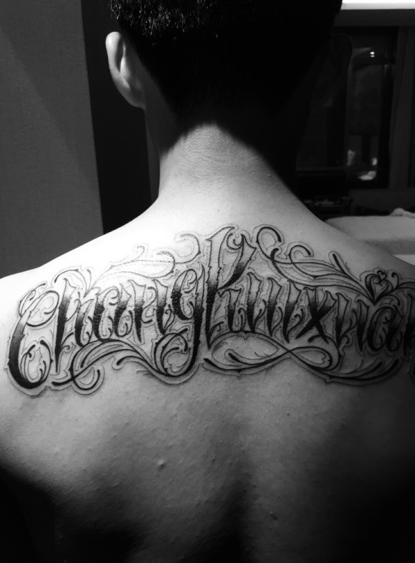 后背个性大花体英文纹身图片