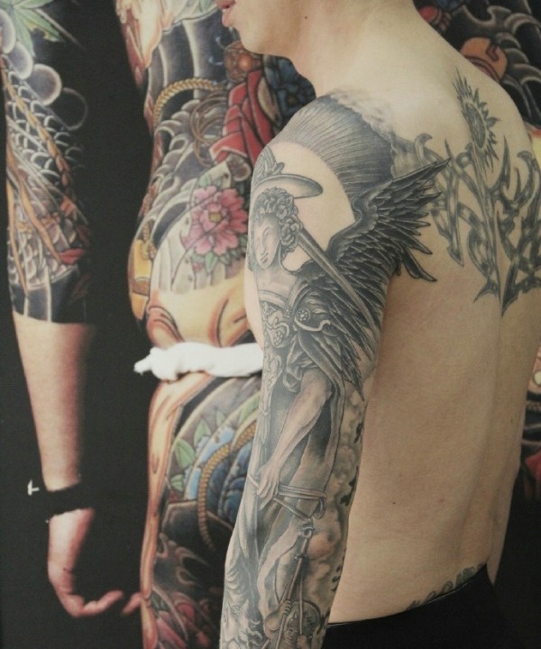 手臂黑白天使纹身图片个性十足