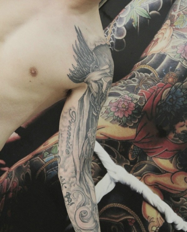 手臂黑白天使纹身图片个性十足
