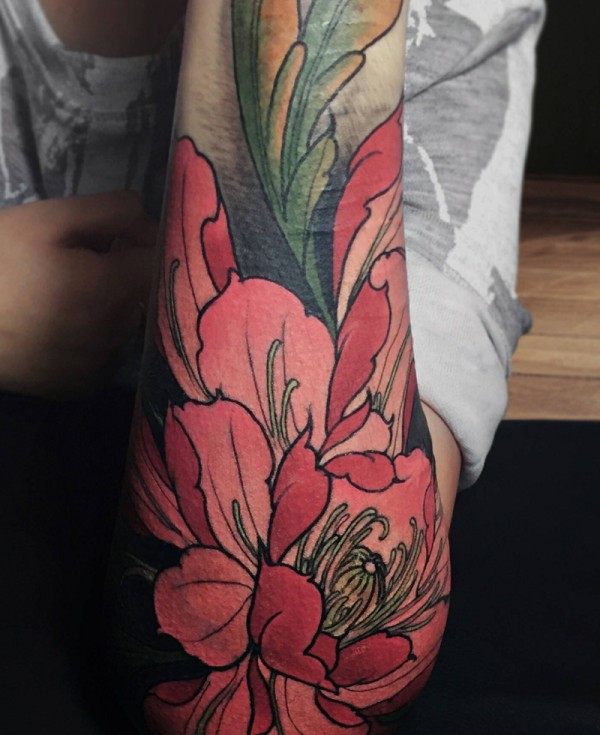 时尚艳丽的花臂花朵纹身图片