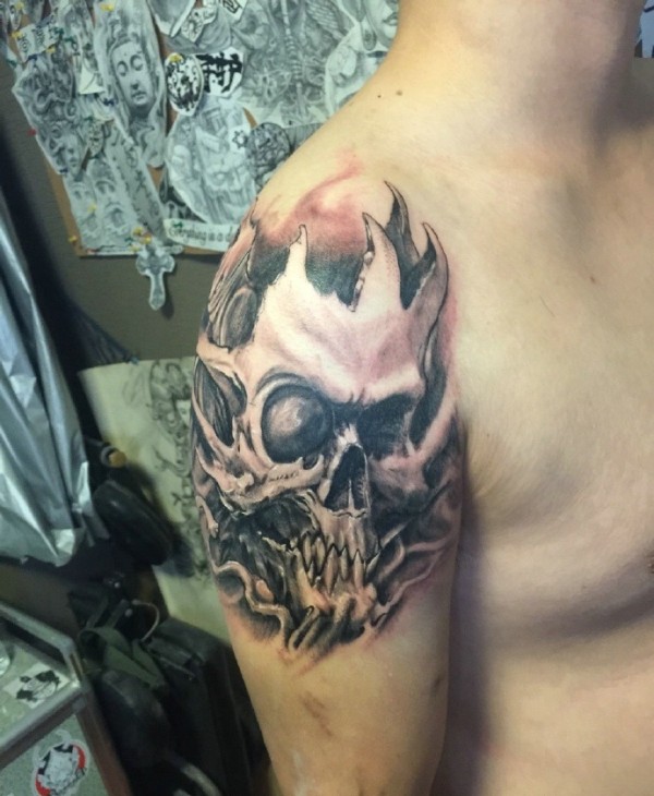 超帅时尚的黑灰骷髅与蛇纹身图案