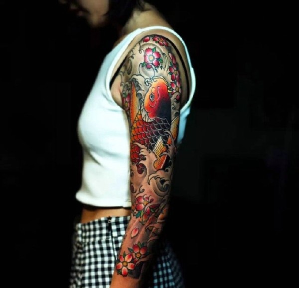 白衣女士花臂鲤鱼纹身图片