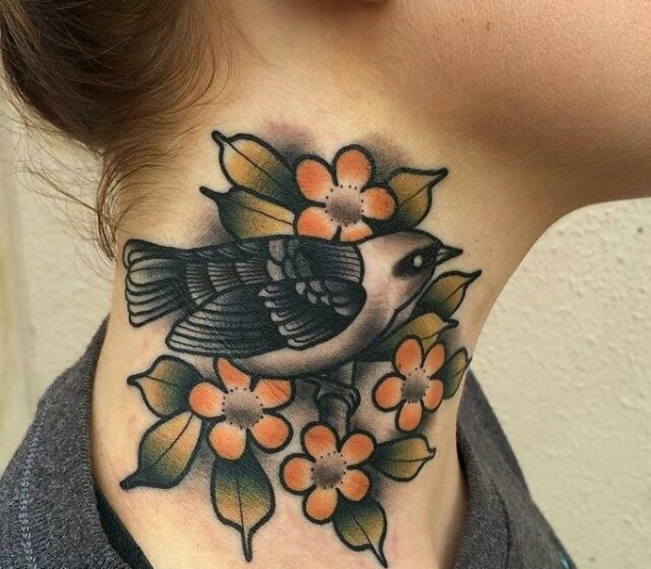 男人脖子彩色燕子刺青图案图片_脖子纹身图案大全_纹身图吧