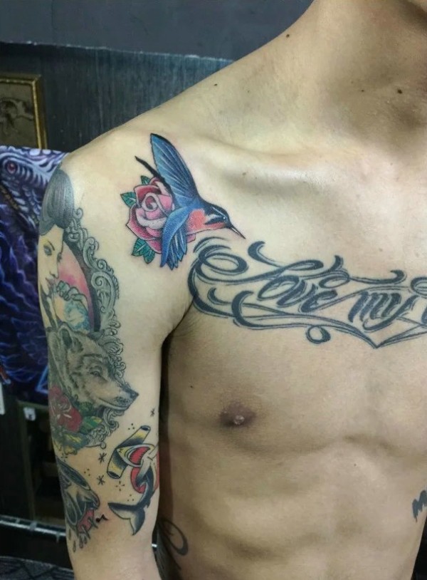 花朵与花体英文一起的胸前纹身图片