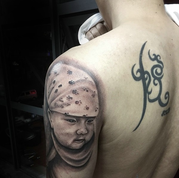 大臂可爱嘟嘟的男宝宝肖像纹身图片
