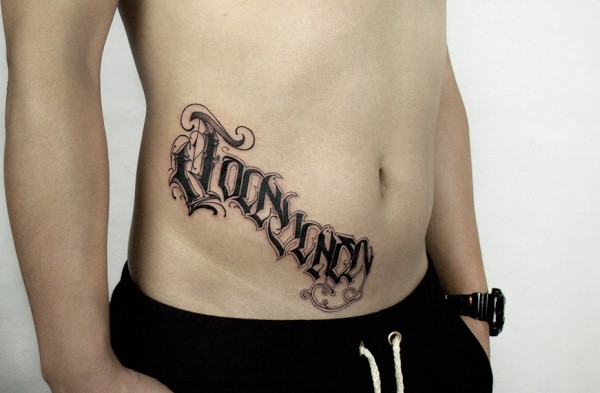 男士腰部上的个性另类英文纹身图片