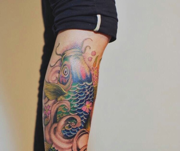 传统鲤鱼花小腿纹身_腿部纹身图案大全_纹身图吧