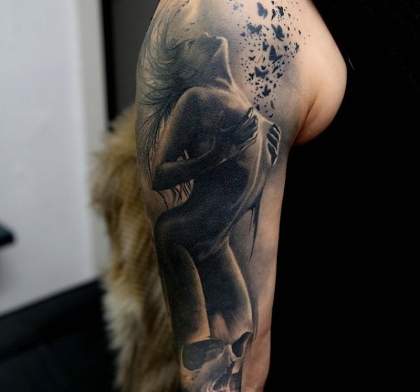 男人大臂黑白彼岸花骷髅_黑白纹身图案大全_纹身图吧