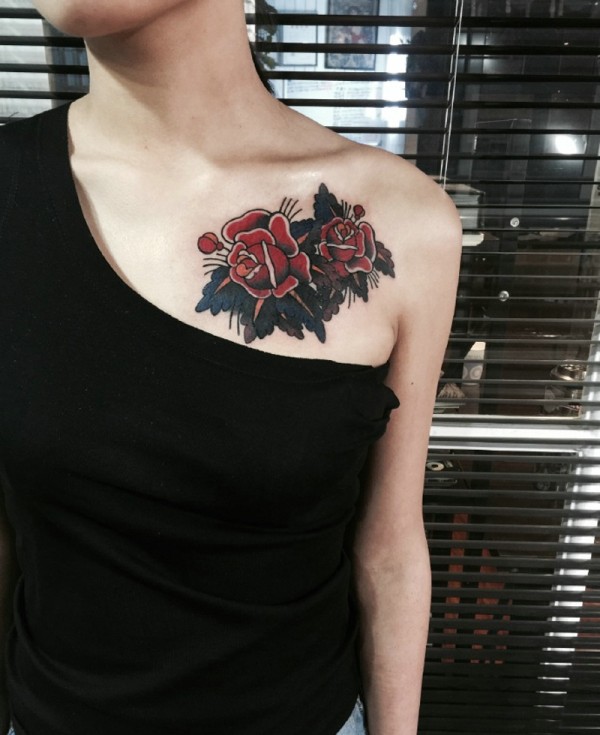 露肩女生锁骨下的两朵红玫瑰纹身图片
