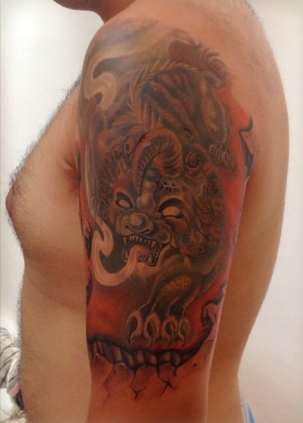 大臂彩色老传统貔貅纹身刺青
